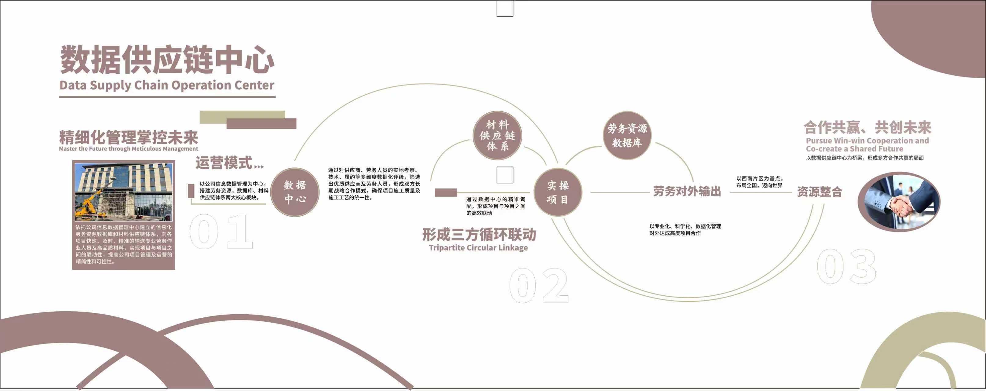我们通过实地考察、技术测评、履约复盘等多维度数据评级,筛选高品质供应商与专业劳务班组,建立百多余家长期战略材料供应合作伙伴库,从源头保障材料品质与施工工艺统一。联动合作方实现材料按需直供、节点精 准配送,统筹劳务高 效施工,严守工期与验收标准,助力打造精品工程。公司以构建高 效产业生态,对外输送材料优 质供应商、劳务团队,打造行业前茅的供应链体系,携手伙伴实现长期共赢。